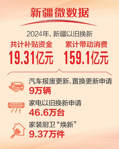 數(shù)據(jù)顯示,截至12月31日,2024年全疆范圍內(nèi)提交汽車報(bào)廢更新、汽車置換更新申請共計(jì)9萬輛,家電以舊換新申請46.6萬臺,家裝廚衛(wèi)“煥新”達(dá)9.37萬件。此外,電動(dòng)自行車以舊換新數(shù)量達(dá)3.32萬輛。這些數(shù)據(jù)的背后,是新疆消費(fèi)者對高品質(zhì)生活的追求和對環(huán)保理念的積極踐行。