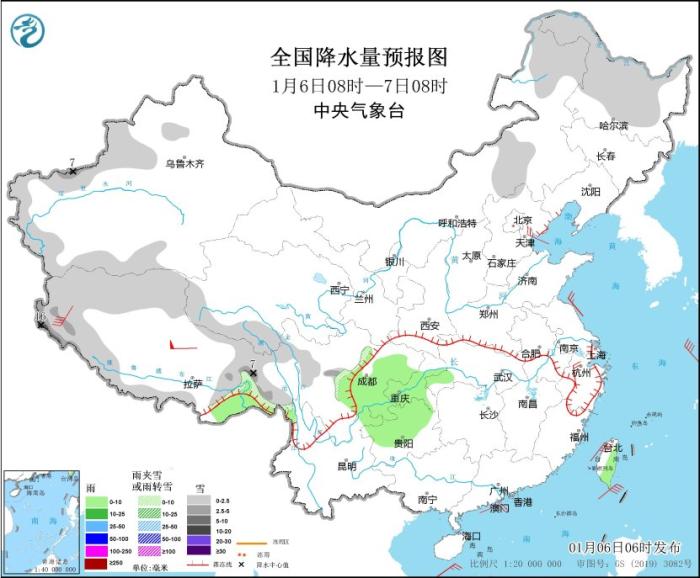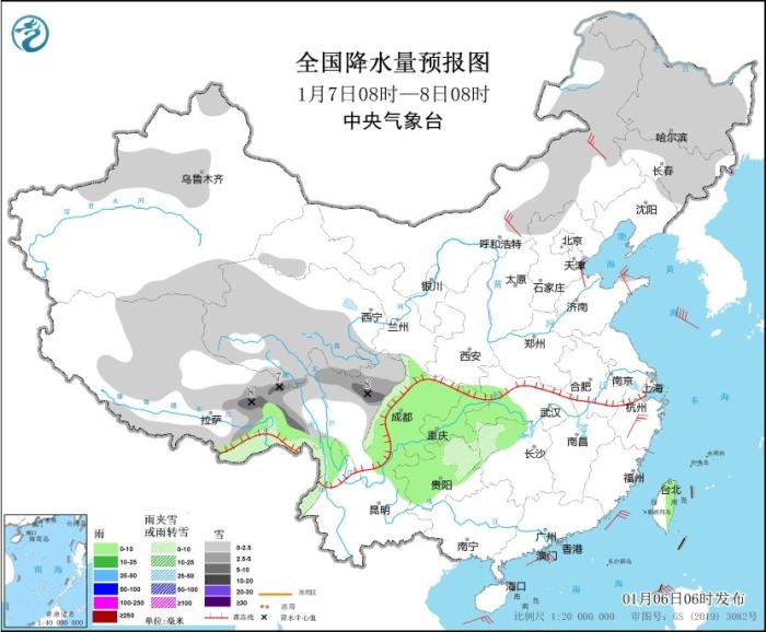 圖1 全國降水量預報圖(1月6日08時-7日08時)