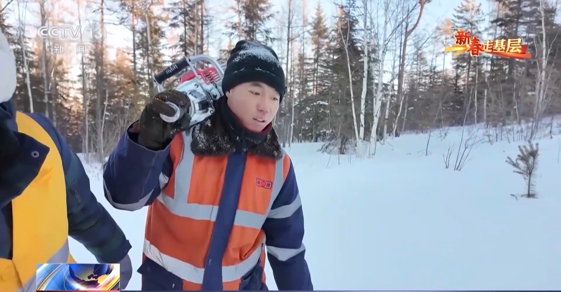 清晨7時多,氣溫在零下30多度,記者跟隨維修工隊的小伙子們前往作業(yè)現(xiàn)場。 剛下過一場大雪,森林里的積雪已經(jīng)沒過膝蓋。