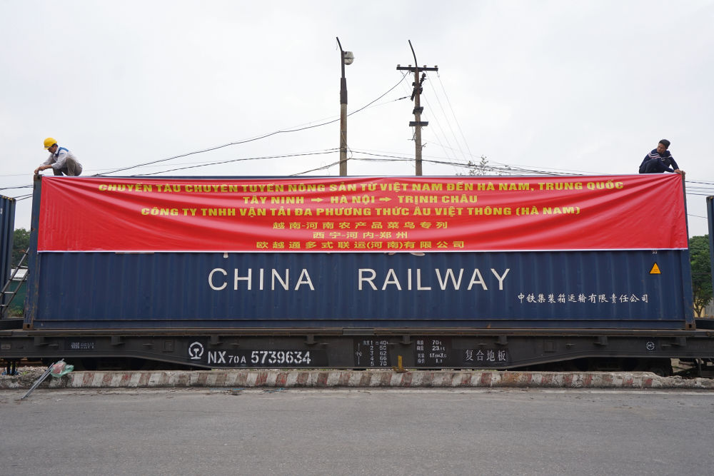 2024年1月15日,載有1000噸木薯淀粉的中越班列列車(chē)從越南河內(nèi)啟程,駛向中國(guó)鄭州。新華社記者 胡佳麗 攝