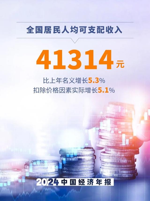 10、全國(guó)居民人均可支配收入41314元,比上年名義增長(zhǎng)5.3%,扣除價(jià)格因素實(shí)際增長(zhǎng)5.1%。