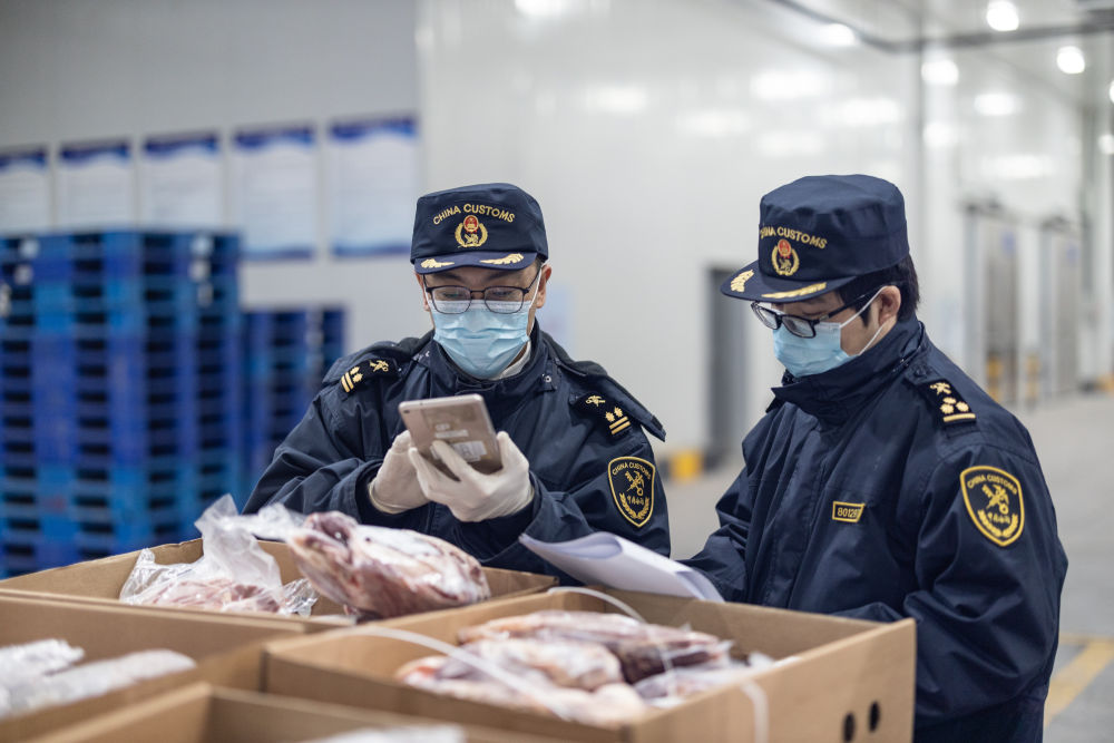 1月17日,在重慶國際物流樞紐園區(qū),重慶海關所屬渝州海關監(jiān)管科副科長劉議凡(左)與同事正仔細查驗通過中歐班列進口的牛肉。新華社記者 黃偉 攝