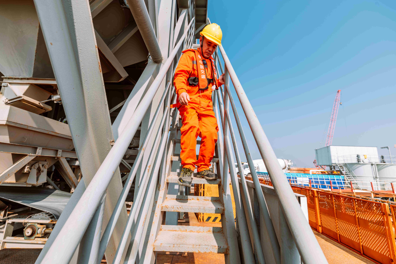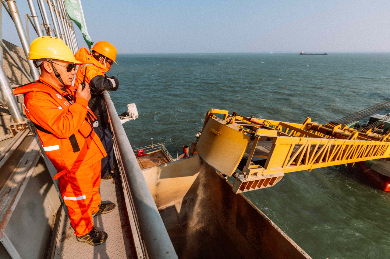 1月17日,夕陽下的廈門劉五店港區(qū),北風勁吹。在距離中交一公局集團廈金大橋(廈門段)項目海上平臺混凝土操作員梁芝敬站立位置不到30米的洋面上,一艘船身印有“帆順168”字樣的補料船,裝載著4000多噸砂石緩緩抵近。船頭前方延伸出一條25米長的傳送皮帶,將船上的砂料源源不斷地送抵老梁眼前的鋼制固料斗內。當天他們要趁著海水退潮帶來的作業(yè)窗口,為站里補上700噸機制砂和900噸粒徑10到20毫米的小石子,以確保混凝土站生產不停機。
