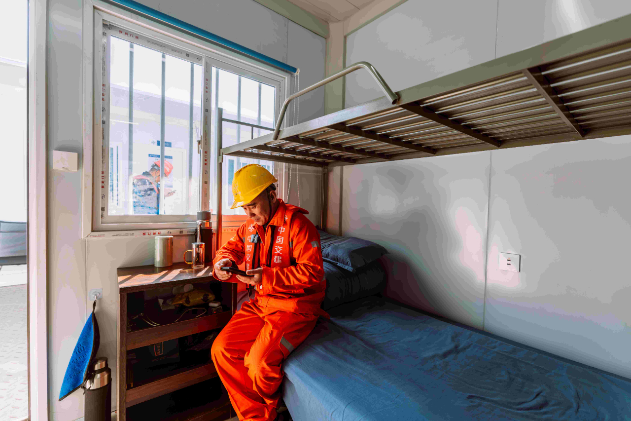 梁芝敬和工友們工作的位置在離岸2海里的海上。一座總面積5萬多平方米的海上平臺,構成了建設者們生活和工作的海上空間。工人們加班建設的劉五店航道橋,是廈金大橋(廈門段)關鍵控制性工程,全長1948米,是福建省內最大跨徑橋梁,也是福建省首座全離岸式海中懸索橋。春節(jié)前,項目部要完成沉井系梁6000方以及主塔套箱6640方封底混凝土澆筑任務。為此,梁芝敬和工友們需要不間斷倒班作業(yè),以保障工程任務能夠如期完成。而記者采訪時,距離梁芝敬上一次離開海上平臺,已經過去57天。