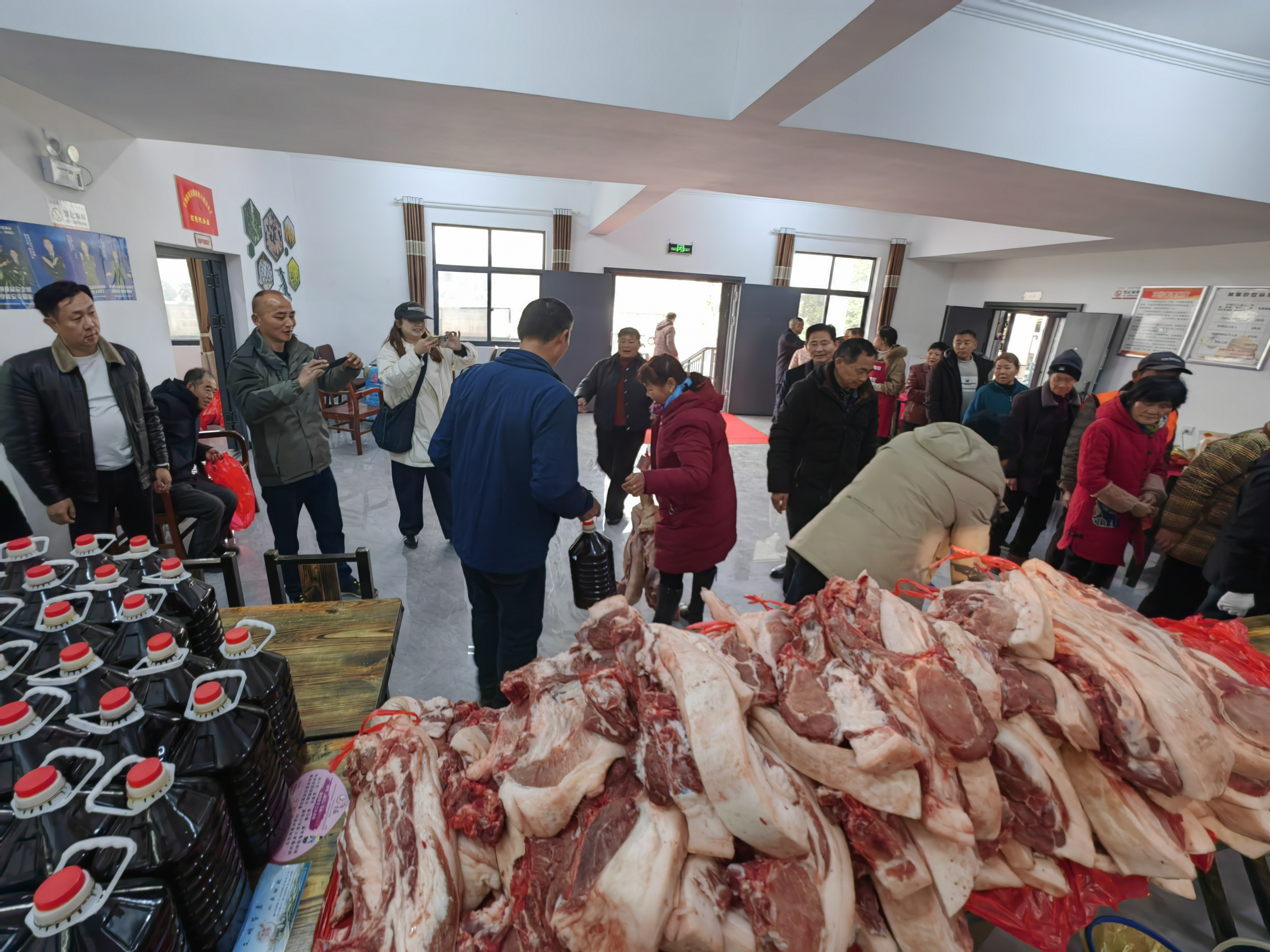 大廳里的長條桌上,一刀刀剁好的新鮮豬肉堆成小山,一袋袋自己種的生態(tài)米裝成包,一提提噴香的菜籽油擺放整齊,村民們早早排成長隊,開心地簽字領(lǐng)錢領(lǐng)米領(lǐng)肉?!罢媸菦]想到我能分到這么多紅利,我每周開車回來打掃衛(wèi)生,順便將社區(qū)朋友們訂的土雞和雞蛋帶回溫泉城區(qū)?!贝迕裢慷收f。
