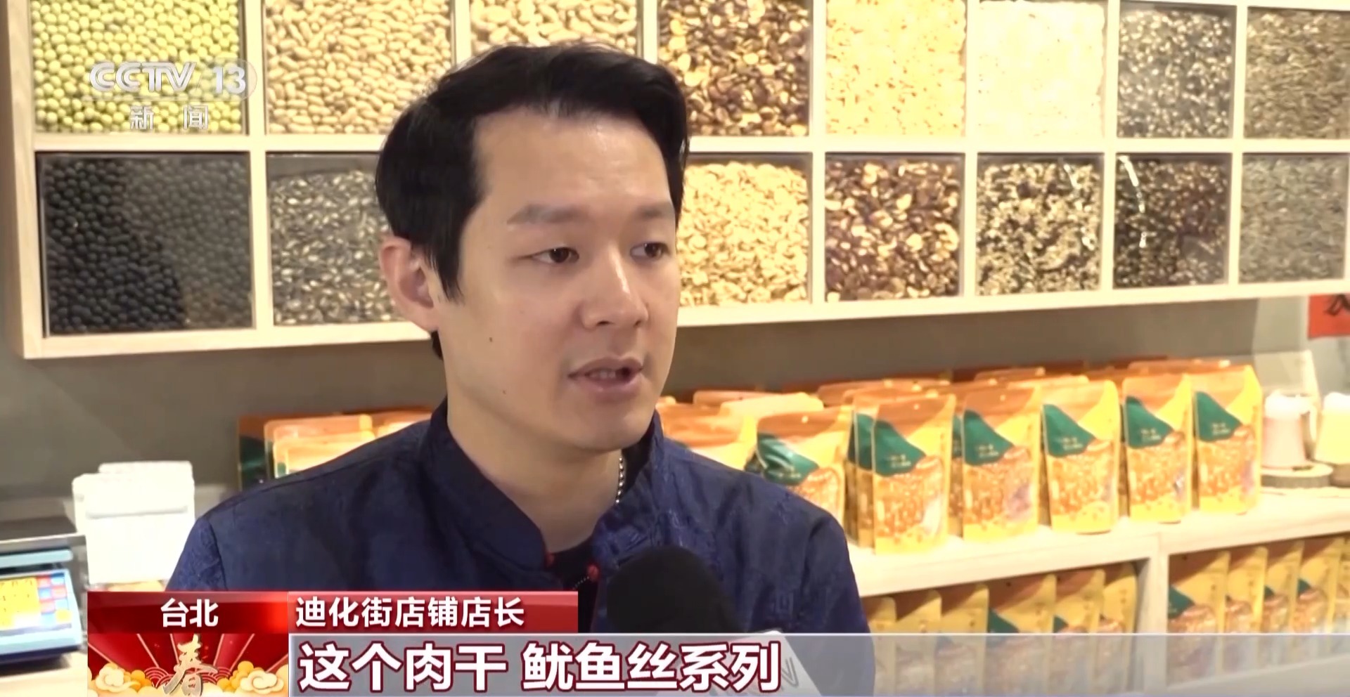 迪化街店鋪店長(zhǎng):春節(jié)期間大部分人家會(huì)選擇這個(gè)肉干、魷魚絲系列,還有我們擺放漂亮的糖果系列為主要的采購(gòu)商品。