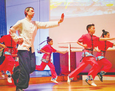 在2025年柏林及勃蘭登堡中國留學生蛇年春節(jié)聯(lián)歡晚會上,當?shù)貙W生表演武術節(jié)目《中國武魂》。記者 劉 赫攝