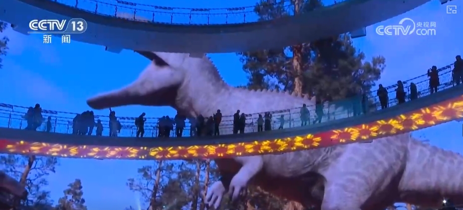春節(jié)期間循環(huán)播放的恐龍科學(xué)藝術(shù)展、春節(jié)主題展、春節(jié)檔電影精編等“四屏聯(lián)動”原創(chuàng)視頻,將光影資源與科教文化有機融合。特別是恐龍科學(xué)藝術(shù)展深受小朋友喜愛。展覽現(xiàn)場,巨幅卷軸屏以直觀的方式展現(xiàn)恐龍的樣貌與龐大體型,邀請觀眾與這些史前巨獸“比高”。環(huán)屏則將播放引人入勝的動畫視頻,生動再現(xiàn)侏羅紀中期恐龍的生活場景,讓觀眾仿佛可以跟隨恐龍的步伐,重返遠古世界。
