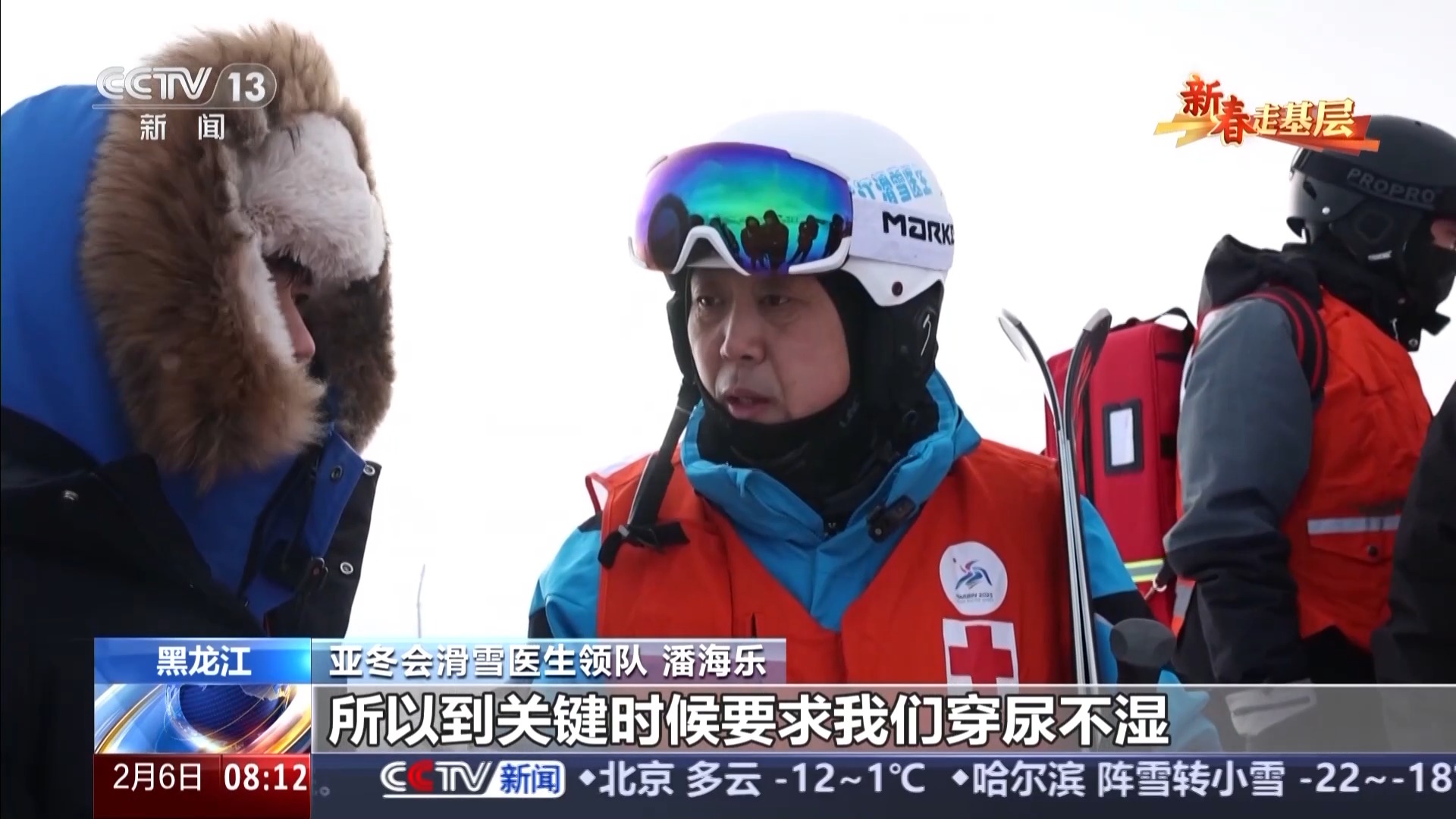亞冬會滑雪醫(yī)生領(lǐng)隊 潘海樂:我們正規(guī)保障高坡度的這些滑雪醫(yī)生要保障四五個小時都不能動,所以到關(guān)鍵時候要求我們穿帶尿不濕。