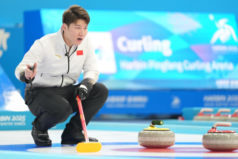 2月6日,中國(guó)隊(duì)選手韓雨在比賽中。當(dāng)日,在哈爾濱舉行的第九屆亞冬會(huì)冰壺混雙循環(huán)賽B組第8輪比賽中,中國(guó)隊(duì)10比1戰(zhàn)勝卡塔爾隊(duì)。新華社記者 王楷焱 攝