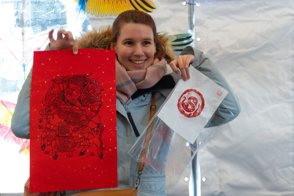 1月17日,在摩洛哥卡薩布蘭卡的“中國廟會”活動現(xiàn)場,摩洛哥民眾展示印有中國農(nóng)歷蛇年主題圖案的木版水印作品。新華社記者霍晶攝