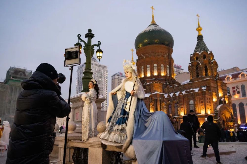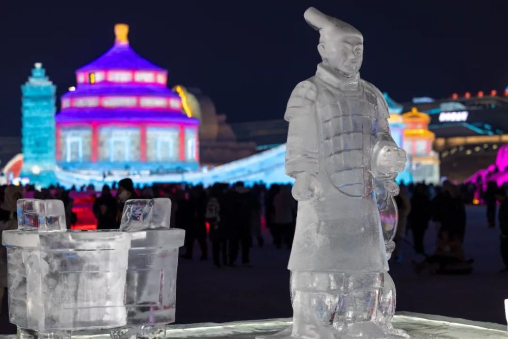 游客在哈爾濱冰雪大世界園區(qū)內(nèi)的冰建祈年殿旁邊游玩。