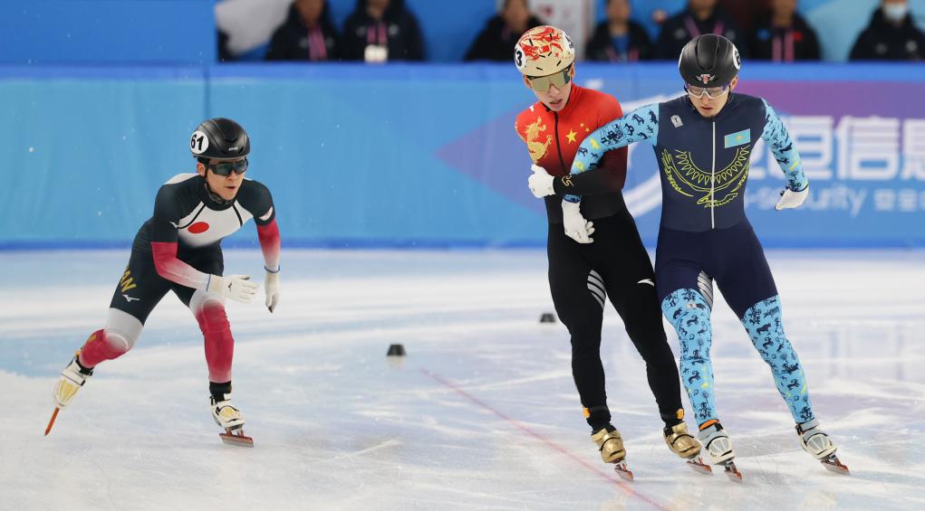 2月7日,中國(guó)選手林孝埈(中)與哈薩克斯坦選手阿迪勒·加利亞赫梅托夫(右)在比賽中沖線。當(dāng)日,第九屆亞冬會(huì)短道速滑男子1500米四分之一決賽在哈爾濱舉行。新華社記者 許雅楠 攝