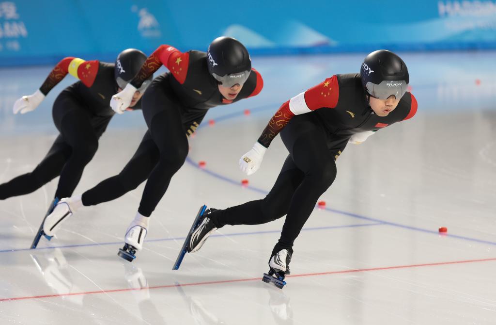 2月10日,中國隊選手高亭宇(右)、寧忠?guī)r、廉子文(中)在比賽中。當日,第九屆亞冬會速度滑冰男子短距離團體追逐賽在哈爾濱舉行。中國隊獲得冠軍。新華社記者 呂帥 攝