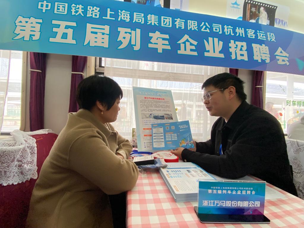 杭州客運(yùn)段甬廣車隊(duì)黨總支書記朱秦予介紹,當(dāng)天除了在K210次列車設(shè)置企業(yè)一對一招聘臺(tái),列車工作人員還通過網(wǎng)絡(luò)直播,在西安開往寧波的K468次、蘭州開往杭州的T114次等列車上同步開展線上招聘會(huì),為更多旅客提供崗位選擇。