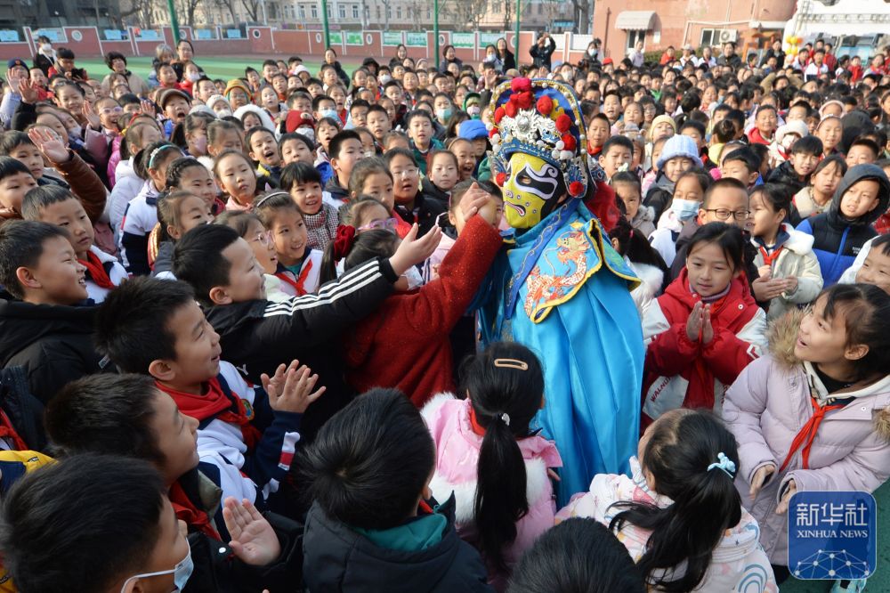 2月14日,學(xué)生們在山東青島四方小學(xué)“傳統(tǒng)文化潤童心”主題活動中與川劇變臉演員互動。新華社發(fā)(王海濱攝)