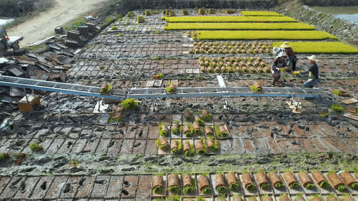 2025年2月13日,云南省西雙版納傣族自治州勐??h,農(nóng)民把傳輸帶上的秧苗搬運(yùn)到車上。(新華社記者 王賢思攝)