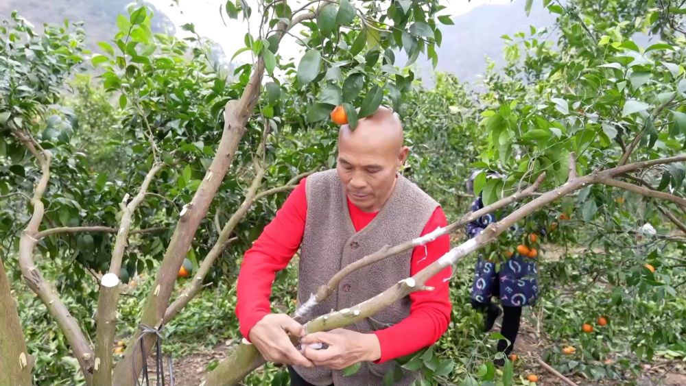 在大山深處,同樣火熱的生產(chǎn)在田陽(yáng)區(qū)五村鎮(zhèn)洞琴村上演。農(nóng)戶們正在加緊嫁接新芽,將沃柑換種為金秋砂糖橘。