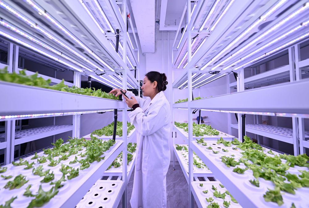 科芯(天津)生態(tài)農(nóng)業(yè)科技有限公司工作人員在實(shí)驗(yàn)室查看農(nóng)作物生長情況。 新華社記者 趙子碩 攝