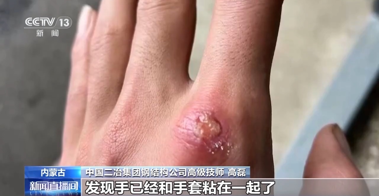 中國(guó)二冶集團(tuán)鋼結(jié)構(gòu)公司高級(jí)技師 高磊:如果你中途停止的話,再重新起弧就可能造成焊接缺陷,我就沒有選擇停,我就咬著牙堅(jiān)持把這段焊縫完成,直到焊到最后,等我往下摘我的焊工手套的時(shí)候,發(fā)現(xiàn)手已經(jīng)和手套粘在一起了,燙出特別大一個(gè)水泡。