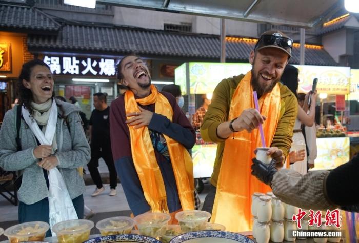 資料圖:青海西寧,外國游客在大新街夜市品嘗青海特色酸奶。 中新社記者 馬銘言 攝