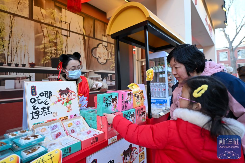 游客在天津哪吒小鎮(zhèn)購(gòu)買糕點(diǎn)產(chǎn)品(3月16日攝)。