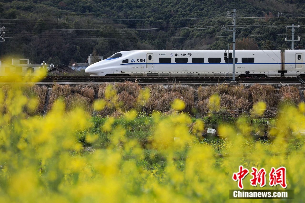 動車組列車從貴廣高鐵黔東南州從江縣境內(nèi)的油菜花田旁駛過。中新社記者 瞿宏倫 攝