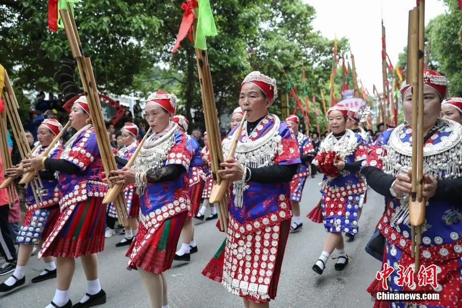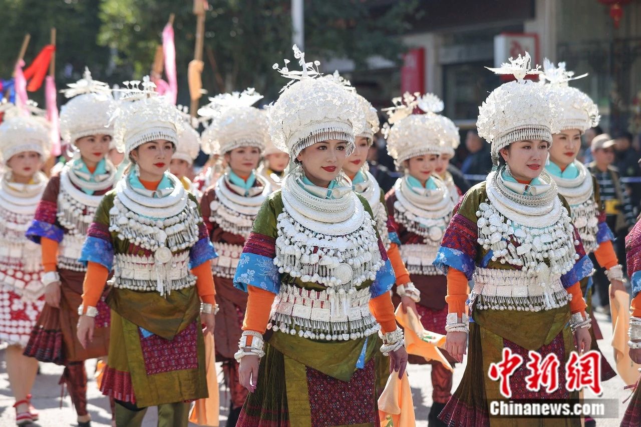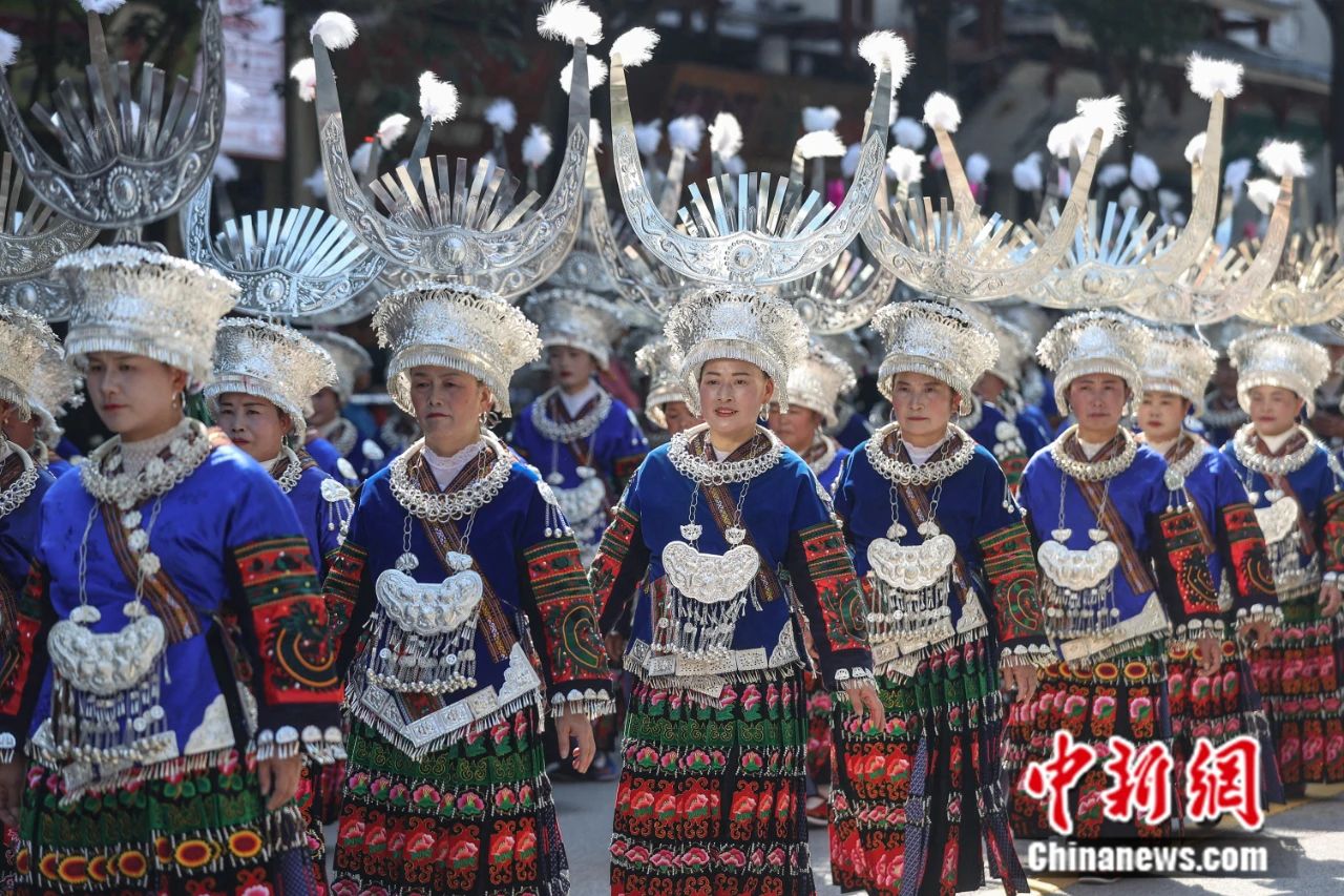 貴州臺江:民眾著苗族盛裝巡游歡度“姊妹節(jié)”。中新社記者 瞿宏倫 攝