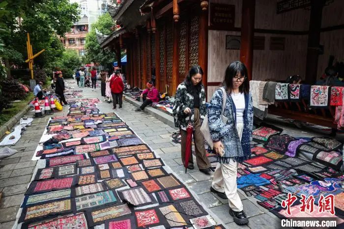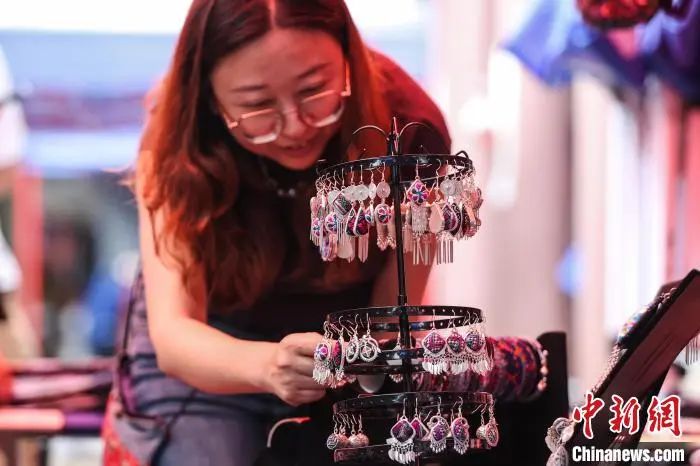 繡里淘非遺集市里的“銀飾+苗繡”組合耳飾吸引游客選購。中新社記者 瞿宏倫 攝
