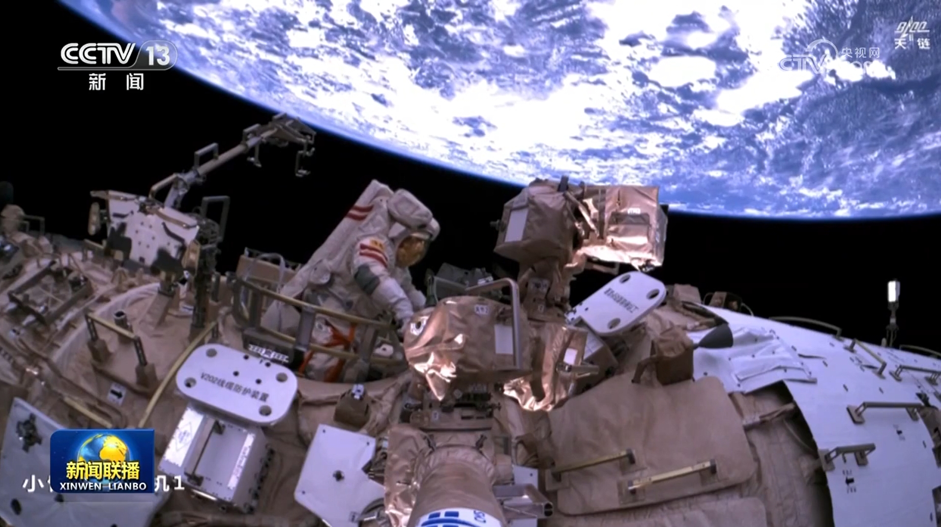 完成設(shè)備安裝工作后,蔡旭哲搭乘機(jī)械臂運(yùn)動(dòng)至空間站對(duì)接口的巡檢點(diǎn)位,進(jìn)行拍攝巡檢工作。此次出艙活動(dòng)歷時(shí)約7小時(shí),在空間站機(jī)械臂和地面科研人員的配合支持下,航天員乘組完成了空間站空間碎片防護(hù)裝置和艙外輔助設(shè)施安裝、艙外設(shè)備設(shè)施巡檢等任務(wù)。