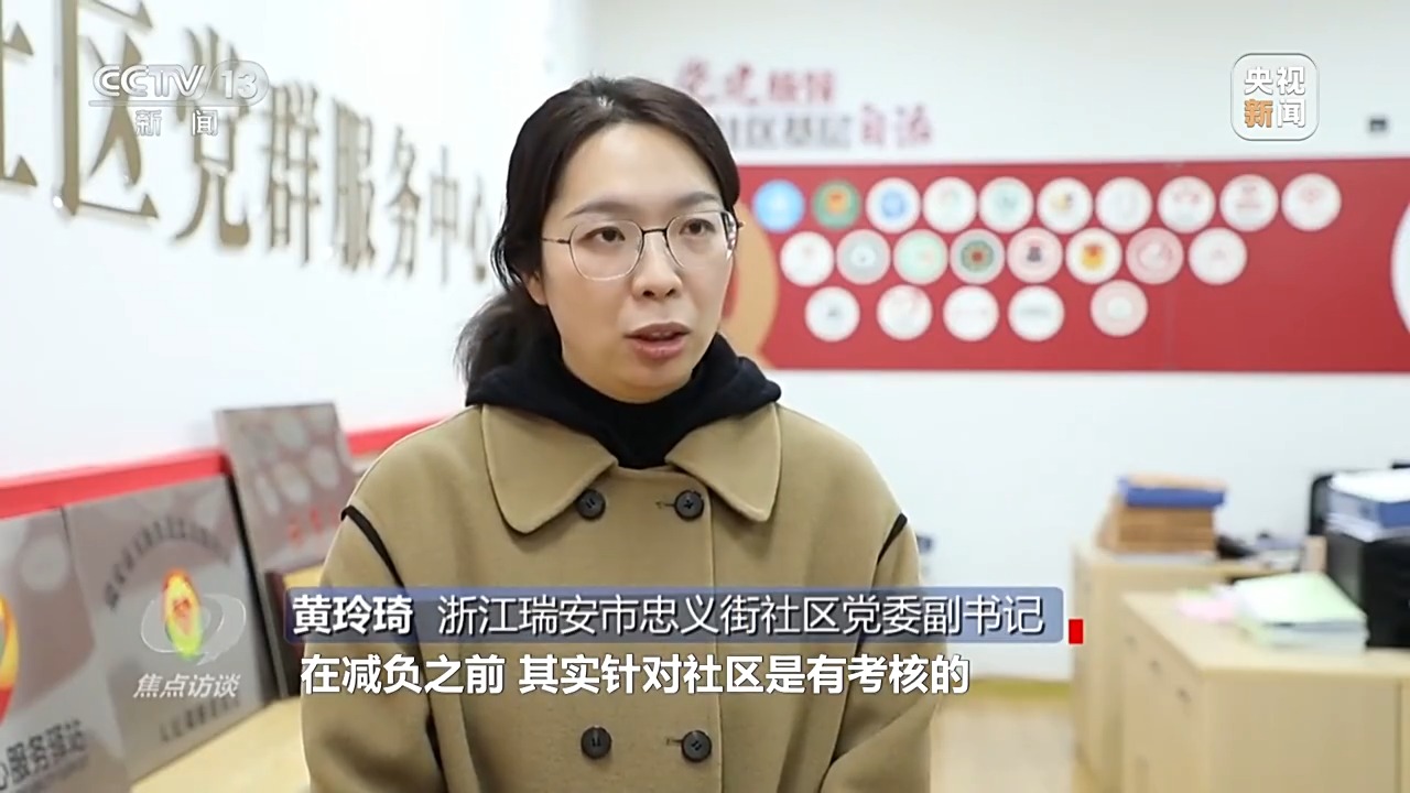 浙江瑞安市忠義街社區(qū)黨委副書記 黃玲琦:在減負之前,其實針對社區(qū)是有考核的,規(guī)定我們每個月要開展八場活動,不可能一整個月都在那里辦活動不開展日常服務,我只能是有一些活動拿過來湊。要想考核好,只能圍繞著考核細則轉,沒辦法。