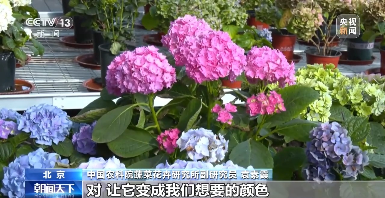 中國農(nóng)科院蔬菜花卉研究所副研究員 袁素霞:讓它往藍變的過程中,變成其他的顏色,比如藍紫色、紫羅蘭色都是可以的。因為我們在土壤中加入了一個關鍵的重要物質(zhì)鋁離子,可以精準調(diào)控,可以讓花變成我們想要的顏色。