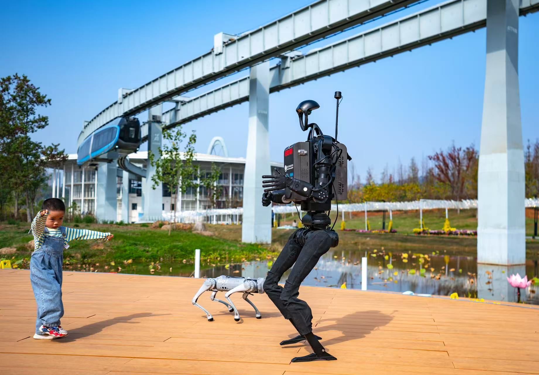 在武漢東湖高新區(qū)空軌高新大道站,一輛空軌列車(chē)正在駛過(guò);生態(tài)大走廊上,裝載了光谷造“大腦”的人形機(jī)器人和四足機(jī)器狗,正與看AI展的小朋友斗舞。