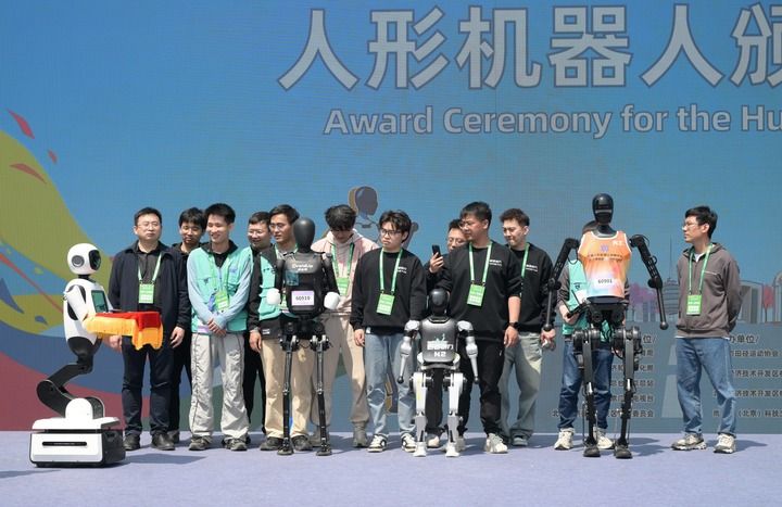 2025年4月19日,一臺機器人在人形機器人頒獎儀式上托舉著獎牌走向獲獎機器人選手和技術團隊。當日,2025北京亦莊半程馬拉松暨人形機器人半程馬拉松舉行。新華社記者 李賀 攝