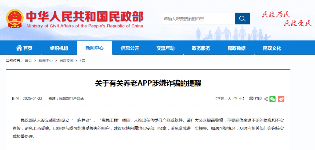 4月22日,民政部發(fā)布公告表示,民政部從未設(shè)立或批準(zhǔn)設(shè)立“一脈養(yǎng)老”“惠民工程”項目,未推出任何類似產(chǎn)品或軟件。請廣大公眾提高警惕,不要輕信來源不明的信息和不實(shí)宣傳,避免上當(dāng)受騙。已經(jīng)參與或可能遭受損失的用戶,建議盡快向?qū)俚毓膊块T報案,避免造成進(jìn)一步損失。如遇可疑情況,及時向相關(guān)部門咨詢核實(shí)或報警處理。(記者朱高祥)