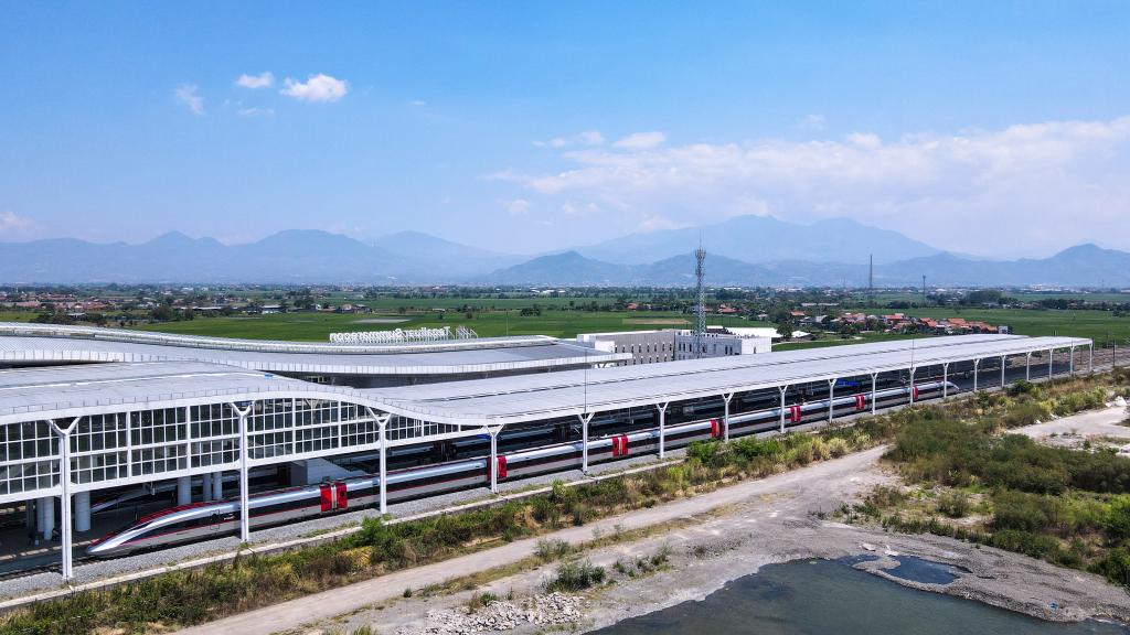 圖為2024年9月13日在印度尼西亞萬隆德卡魯爾站拍攝的停靠在站臺(tái)上的雅萬高鐵高速動(dòng)車組(無人機(jī)照片)。新華社記者徐欽攝