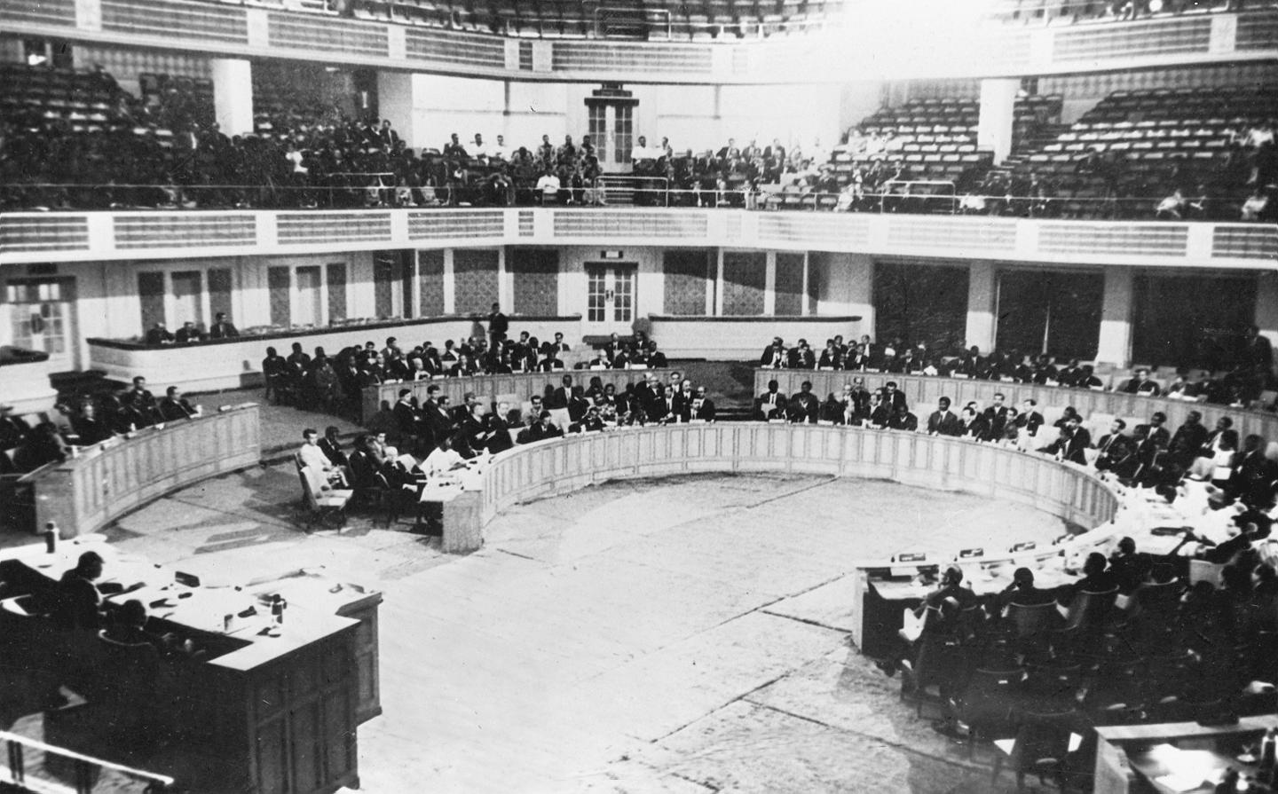 1955年4月18日至24日,29個(gè)亞非國(guó)家和地區(qū)的政府代表團(tuán)在印度尼西亞萬隆召開亞非會(huì)議。圖為萬隆亞非會(huì)議會(huì)場(chǎng)內(nèi)景。新華社記者錢嗣杰攝
