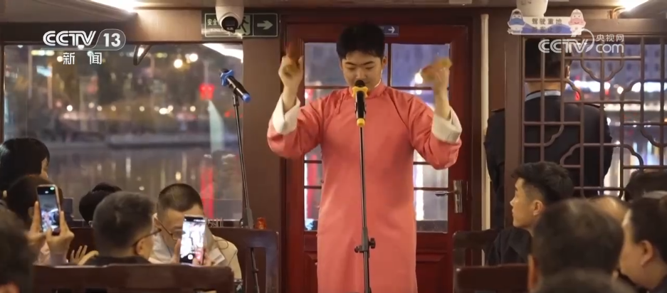 這段快板可不是在傳統(tǒng)的茶館里,而是在海河的游船上。這是最近在天津特別火的旅游項(xiàng)目,相聲主題游船特邀津門曲藝名家登船獻(xiàn)藝,將傳統(tǒng)相聲與海河風(fēng)光巧妙融合,游客在欣賞兩岸美景的同時(shí),又可以感受曲藝的魅力,可謂一舉兩得。游客說:“在游船上聽相聲是不一樣的體驗(yàn),上了游船,站在甲板上,看著兩邊的霓虹燈光,特別愜意?!?/p>