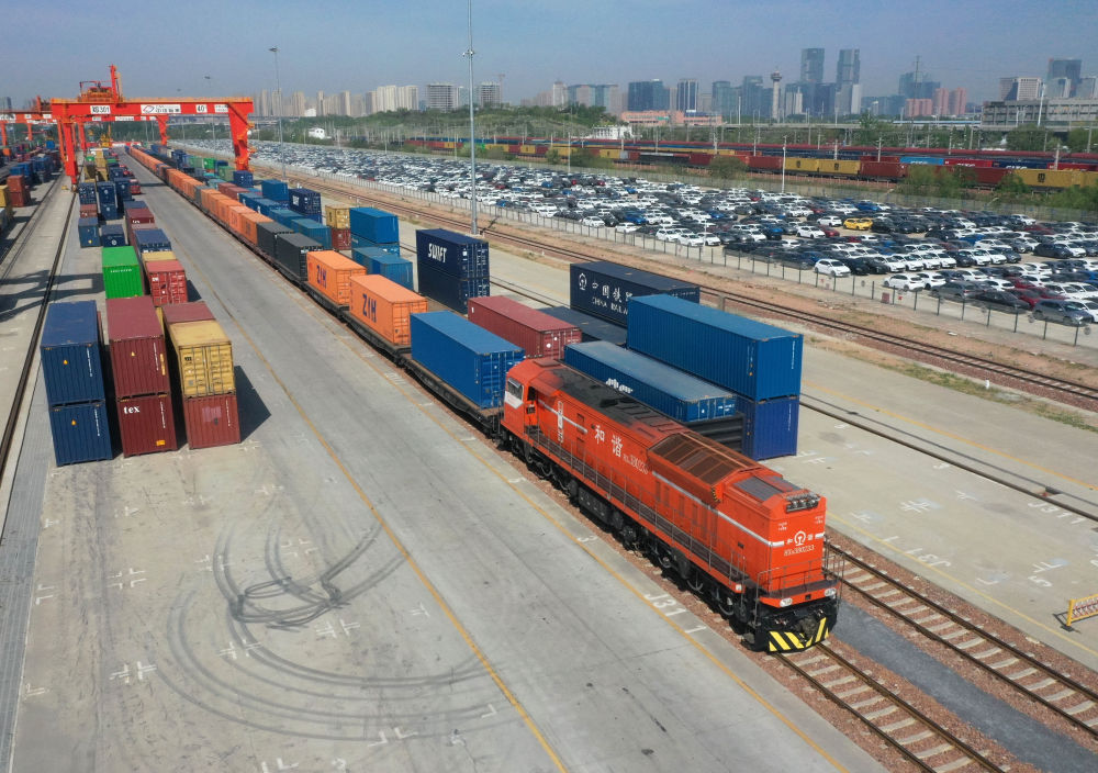 2025年4月15日,X8003次中歐班列(鄭州)??吭趪?guó)鐵集團(tuán)鄭州局圃田車站(無人機(jī)照片)。新華社記者 李嘉南 攝