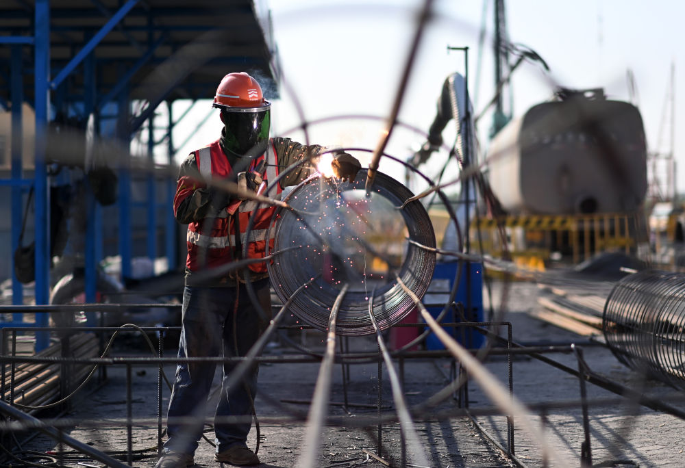 4月25日,工人在天津港第一港埠有限公司散糧三期新建筒倉工程建設現(xiàn)場施工。新華社記者 趙子碩 攝