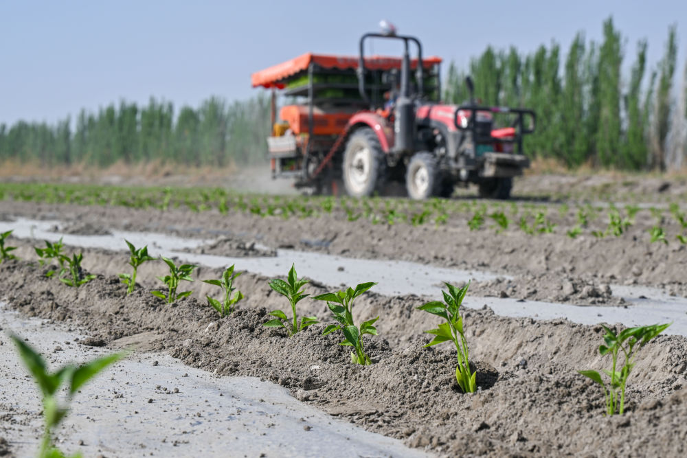 在新疆巴音郭楞蒙古自治州博湖縣本布圖鎮(zhèn),農(nóng)戶操作移栽機(jī)在農(nóng)田里移栽辣椒苗(4月29日攝)。新華社記者丁磊 攝