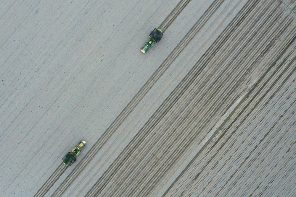 在新疆巴音郭楞蒙古自治州博湖縣本布圖鎮(zhèn),農(nóng)戶操作移栽機(jī)在農(nóng)田里移栽辣椒苗(4月28日攝,無人機(jī)照片)。新華社記者丁磊 攝