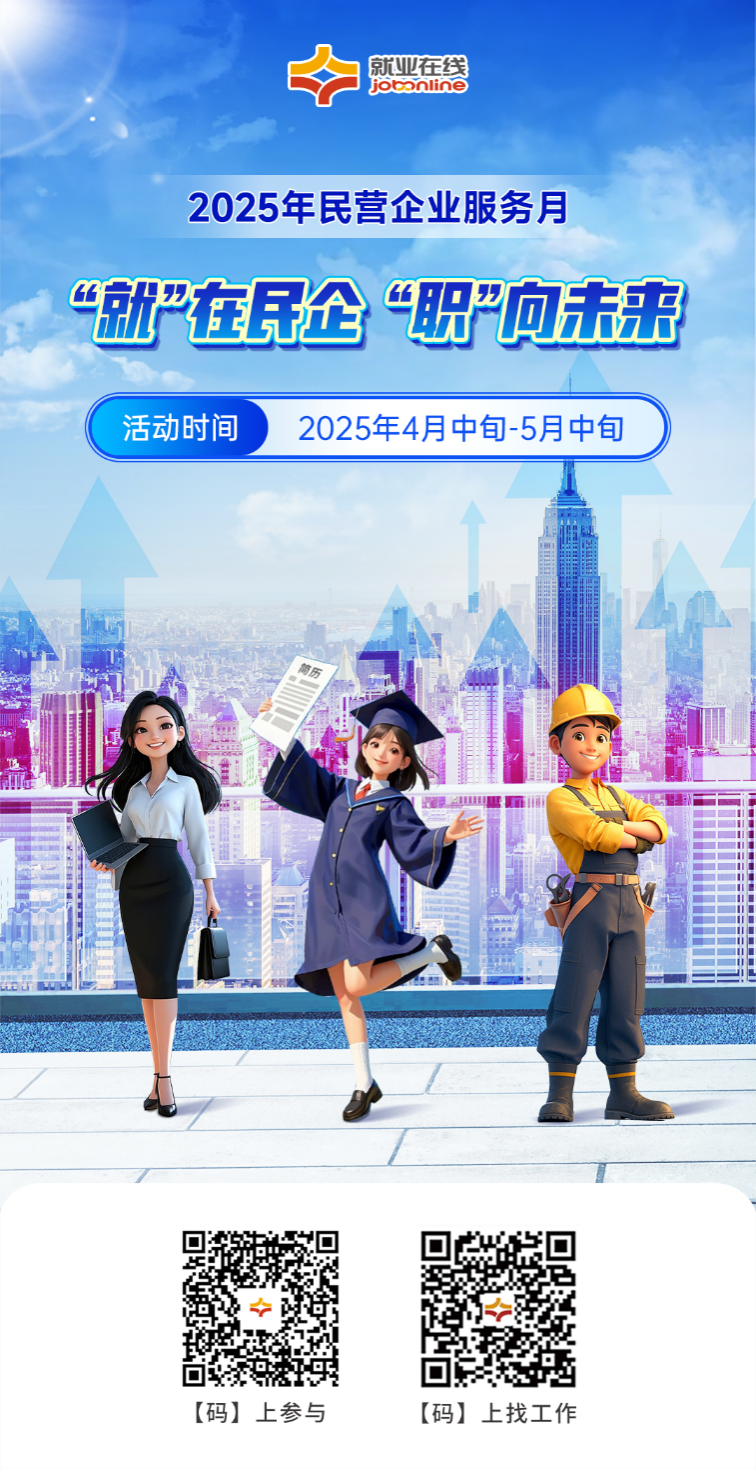 為支持民營經(jīng)濟發(fā)展,促進高質(zhì)量充分就業(yè),按照人力資源社會保障部等6部門關(guān)于開展2025年民營企業(yè)服務(wù)月活動安排,“就業(yè)在線”平臺開展2025年民營企業(yè)服務(wù)月線上招聘求職服務(wù)活動,助力民營企業(yè)招聘用工和廣大勞動者求職就業(yè)。