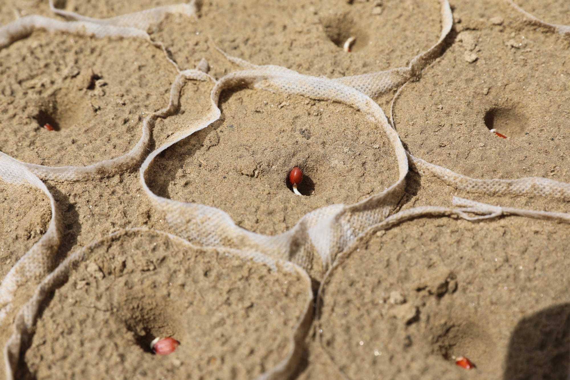 播種前,土地經(jīng)過改良,混合化肥與羊糞的有機(jī)肥料被均勻撒入沙土,再裝入育苗袋。在育苗袋里播種后,工作人員澆水、埋土、覆膜、搭建拱棚,確保幼苗在防風(fēng)保溫的環(huán)境中茁壯成長(zhǎng)。