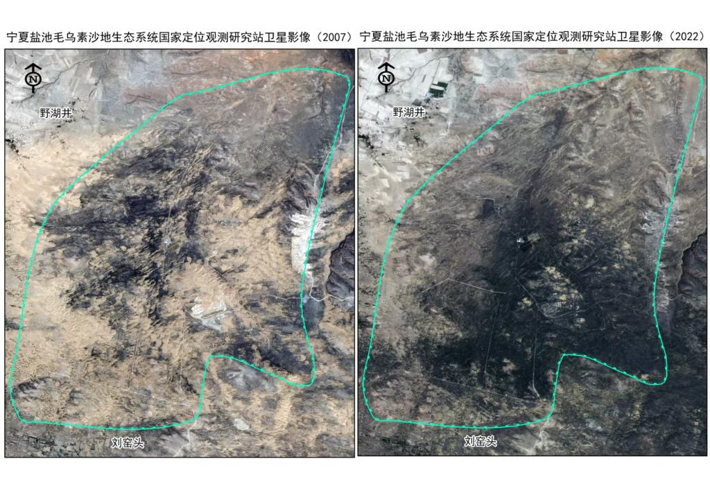 寧夏鹽池毛烏素沙地生態(tài)系統(tǒng)國家定位觀測研究站2007年和2022年衛(wèi)星影像對比圖。(受訪者供圖)