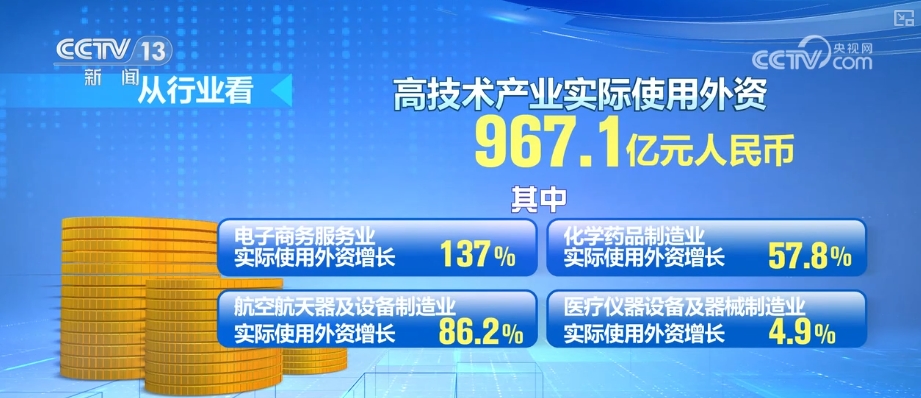 其中,電子商務(wù)服務(wù)業(yè)、航空航天器及設(shè)備制造業(yè)、化學藥品制造業(yè)、醫(yī)療儀器設(shè)備及器械制造業(yè)實際使用外資分別增長137%、86.2%、57.8%和4.9%。