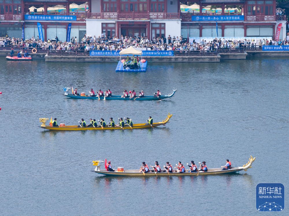 5月24日,龍舟隊在江蘇省南京市莫愁湖公園參加比賽(無人機(jī)照片)。新華社發(fā)(楊素平攝)