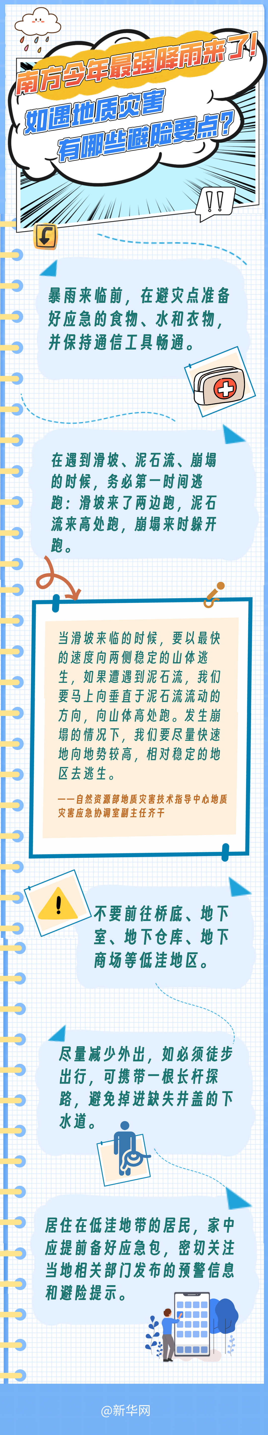 中央氣象臺消息,預(yù)計5月27日至29日,我國南方將出現(xiàn)今年以來最強降雨過程,并與前期強降雨區(qū)高度疊加,暴雨災(zāi)害風(fēng)險高。新一輪強降雨過程范圍廣、累計降水量大,地質(zhì)災(zāi)害風(fēng)險不容忽視。強降雨可能引發(fā)哪些地質(zhì)災(zāi)害?地質(zhì)災(zāi)害發(fā)生前,有哪些征兆?如遇地質(zhì)災(zāi)害,有哪些避險要點?