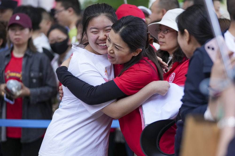 6月7日,在哈爾濱市第九中學(xué)考點,考生走入考場前與老師擁抱。(新華社記者 王建威 攝)