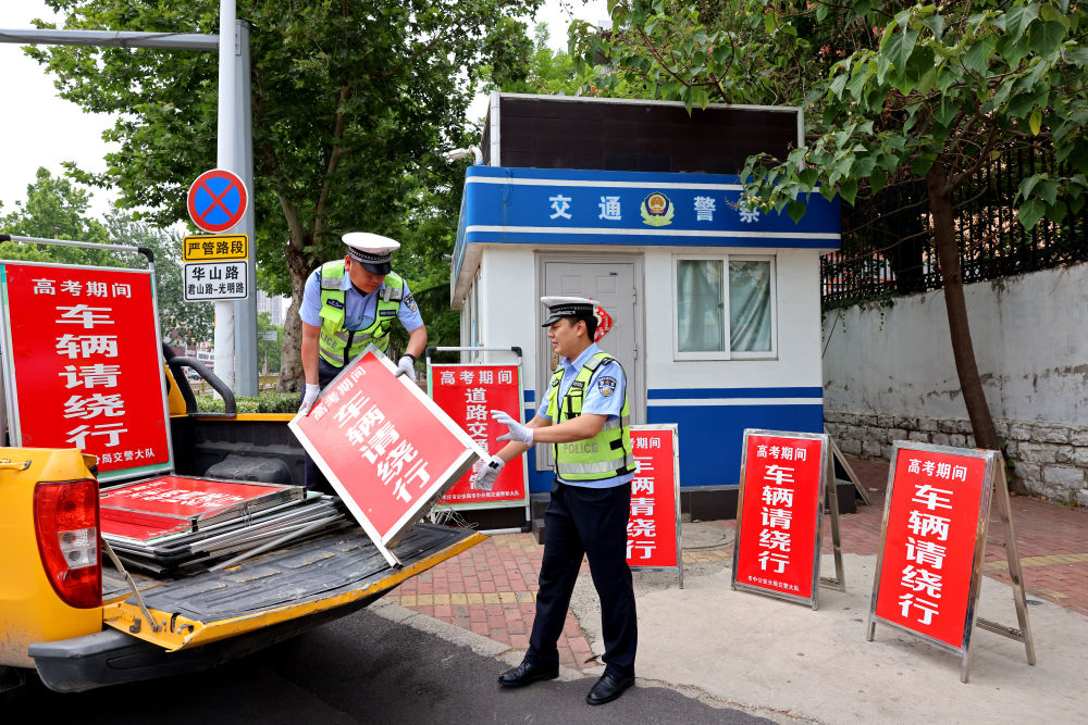6月6日,山東省棗莊市公安局市中分局交警大隊輔警把高考期間道路交通管制標(biāo)志牌運送到各考點執(zhí)勤崗。新華社發(fā)(孫中喆 攝)